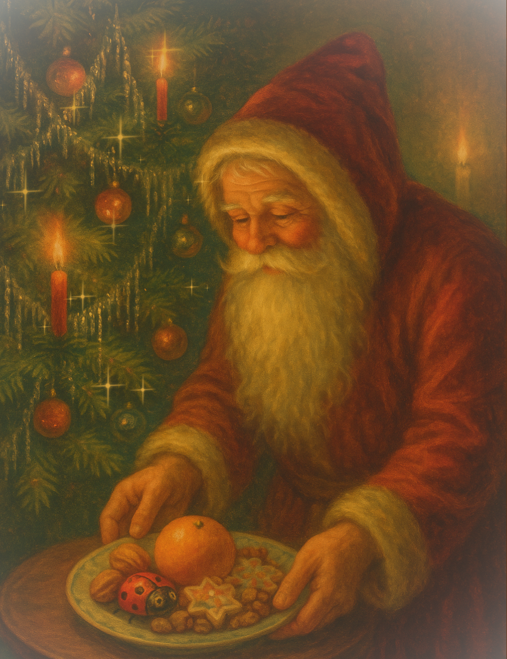 At the foot of the tree waited the Bunte Teller, the colourful plates my mother assembled as though she were preparing offerings for a goddess she didn’t know she believed in. Oranges and tangerines, walnuts and hazelnuts, chocolate ladybugs wrapped in shiny foil, marzipan, Christmas cookies dusted with sugar. At the time, I only tasted sweetness. Now I see symbolism: